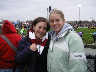 This weekend Nick and I went to the famous Little 500 bicycle race. We went with our friends Sylvia (a fellow optometry student) and Todd. They both went to IU for their undergrad degree and had been to several races before this one. The race is named after the Indy 500, but the bicyclists only actually ride 200 laps. This year was the 58th annual men's race (the women's race was on Friday when I was in class and has been held for the past 20 years or so). If you have never seen the old movie "Breaking Away," you really should watch it. It is filmed in Bloomington and shows the bike race. The race is ridden by teams of four guys who can switch out at pretty much anytime during the race. There were 33 teams this year, many from fraternities, but other groups participated as well. The competition is serious, and they race at speeds of around 20-25 miles per hour. The pace cars from the Indianapolis 500 even lead the bikers in a pace lap. It was a lot of fun, but unfortunately it was freezing cold and even sprinkled for awhile. The whole week had been warm until race day on Saturday and then the cold front hit. I heard that the crowd this year was a lot smaller than normal because of the cold, so it will be interesting to go again next year for comparison!